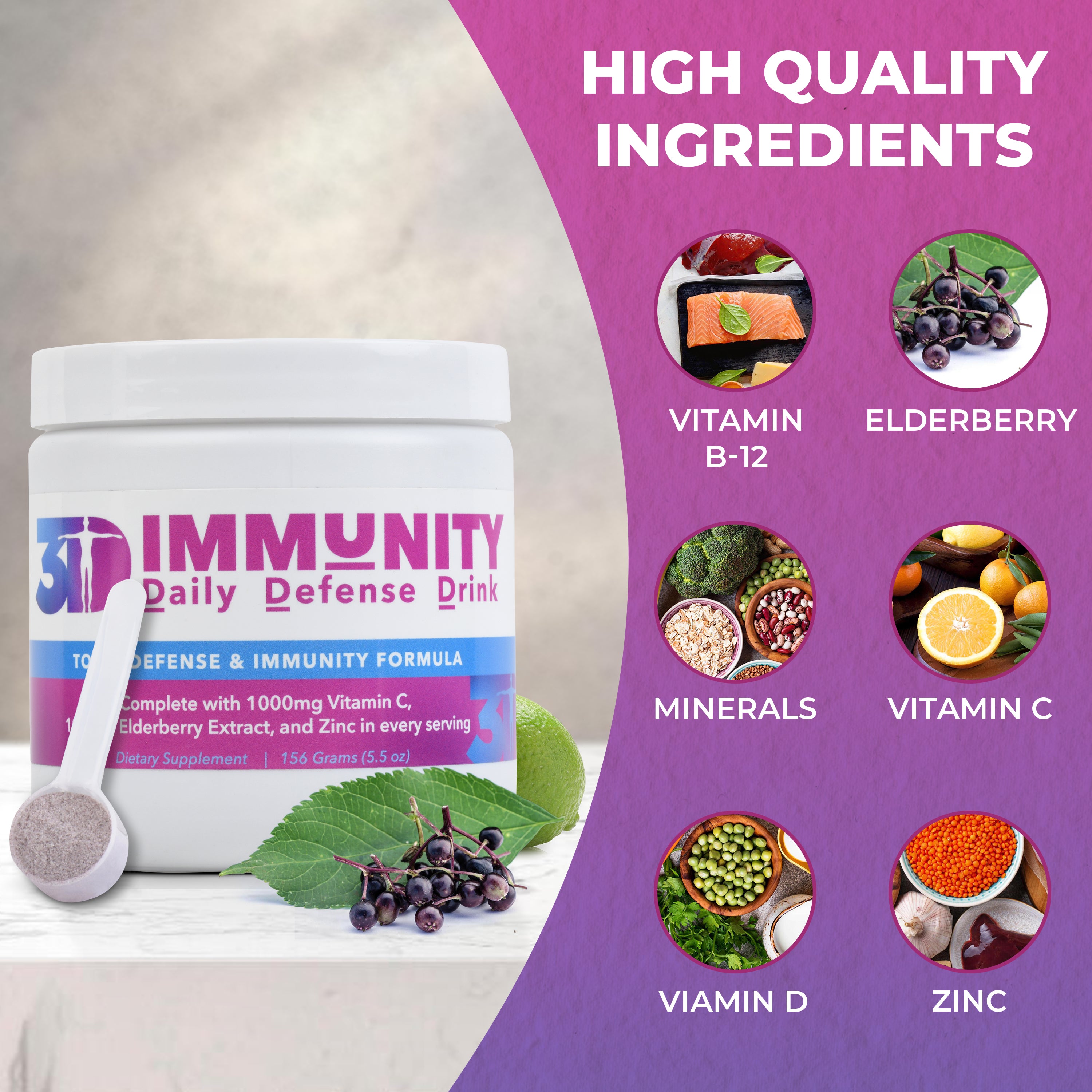 Each ingredient is thoughtfully selected for its unique benefits, ensuring that every sip of our drink delivers targeted support for your immune system. From vitamin B12 and elderberry to essential minerals, vitamin C, and vitamin D, our formula combines nature's finest to promote vitality and resilience. Join us on this journey as we dive into the science behind our ingredients and discover how they work together to fortify your body's defenses. Prepare to uncover the secrets of immune support with 3D Daily Defense Drink's premium blend of nutrients.